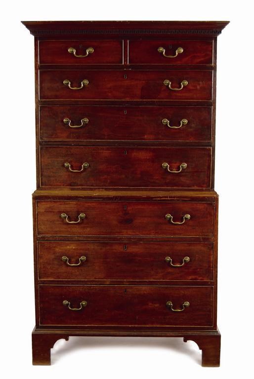 A late George III mahogany chest on chest, with original brass swan neck handles, 70.75in (179.5cm) h, 41in (104cm) w, 22.5in (57cm) d. Cracks to left top half and both right sides, general wear, chips.