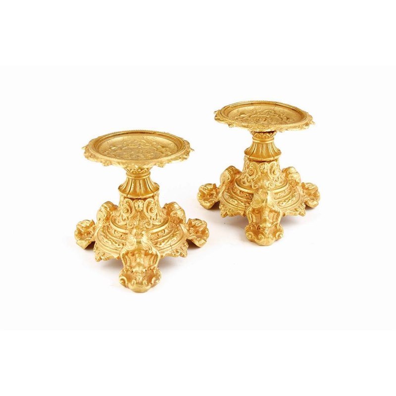 A pair of late 19th century French gilt spelter tazzas, 6in (15cm) h, 5.5in (14cm) dia.