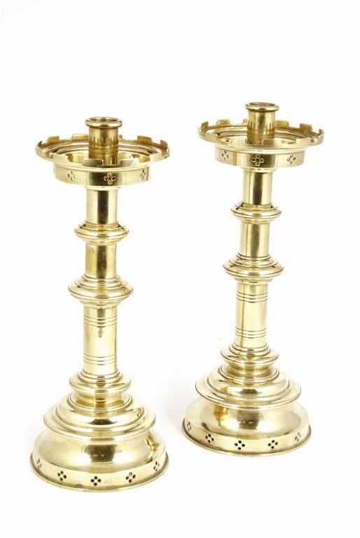 A pair of Victorian brass altar candlesticks, with crenellated tops and knopped stems, 14in (35.4cm) h, 5.5in (14.2cm) d.