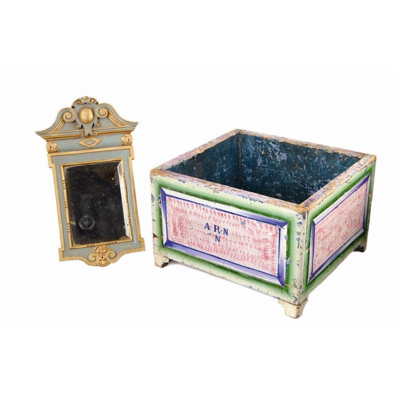 A painted jardiniere, the sides with panels, one inscribed with initials ' A.R.N. N' 7.5in (18.8cm) h, and a small painted wall mirror in 18th century Italian style, 12in (30.7cm) h. (2)