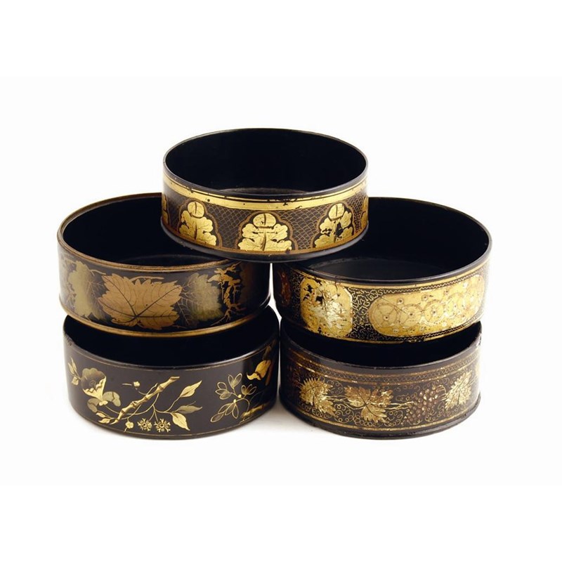 Five early 19th century papier-mache coasters, each decorated a differing design. (5)