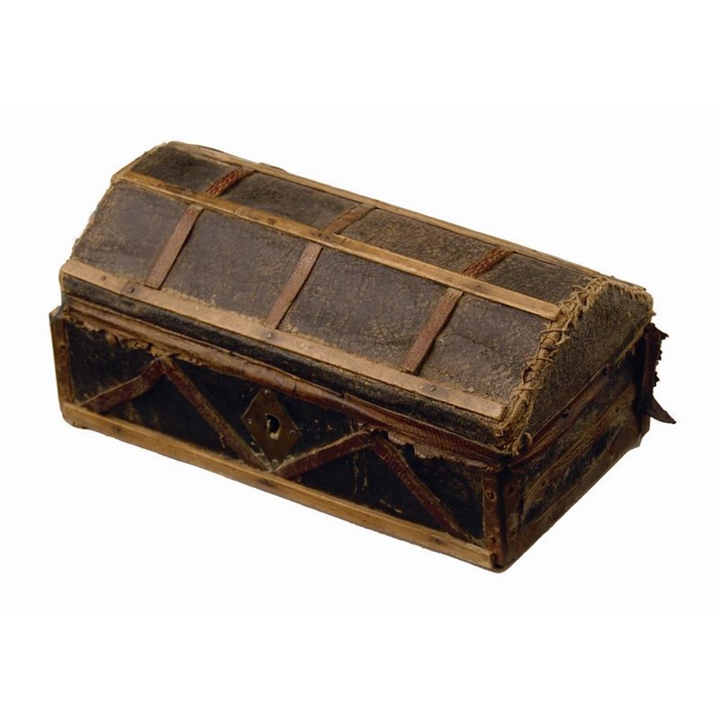 An 18th century leather covered small casket, possibly a bible box, 4in (10.1cm) h, 8.75in (22.4cm) w, 5in (12.7cm) d.