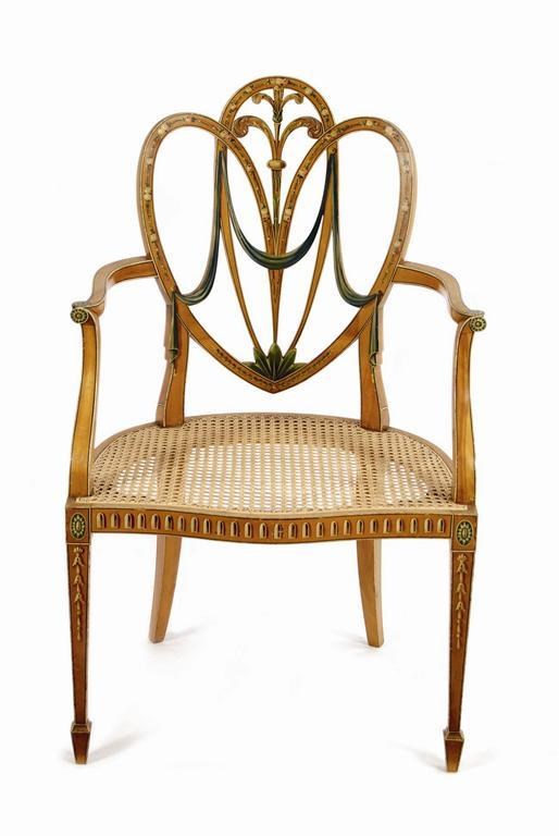 A satinwood and polychrome decorated open armchair, in Sheraton revival style, floral painted with feather plumes, drapes, husks, paterae and foliage, with a serpentine front cane seat, early 20th century.