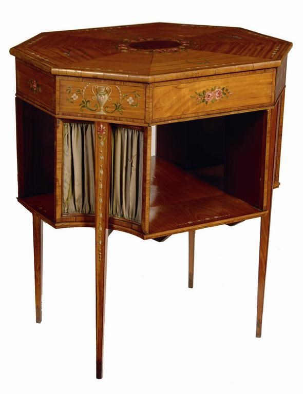 A late Victorian satinwood and painted octagonal centre table, the top centred an oblong amboyna panel to rose garlands and wreaths, to a tulipwood banded edge above a conforming frieze with a central drawer on square tapering legs with a stretchered undertier with fabric backed corners, 28.5in (72.5cm) h, 25.25in (64cm) w, 20in (51cm) d.