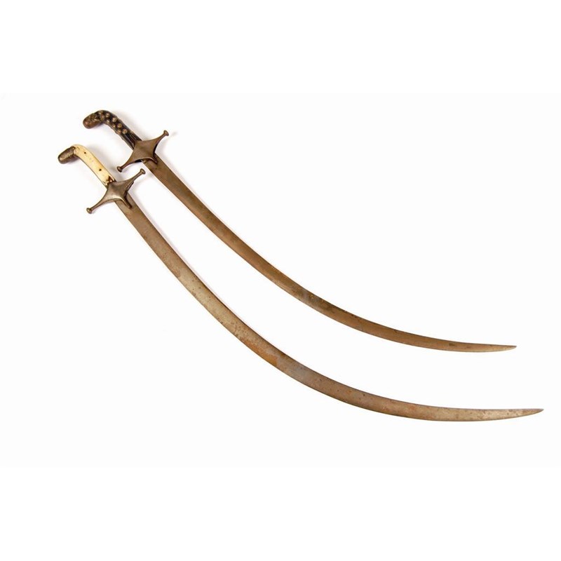 An Indian shamshir, with a curved blade and bone and steel handle, 36.75in (93cm) l, and another with a lacquered wood handle having applied prunts. (2)