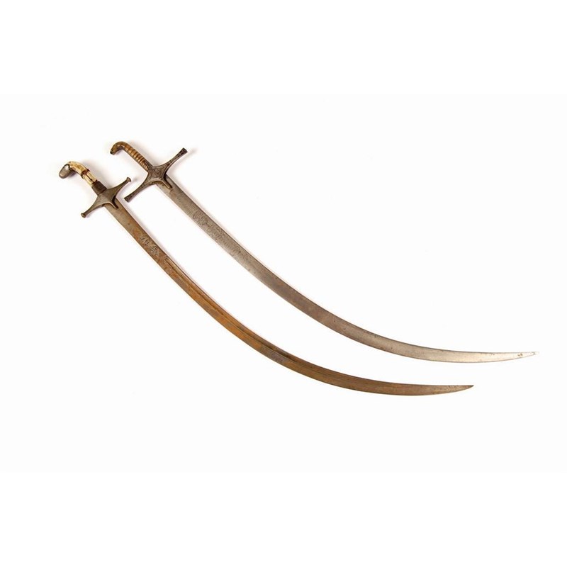 A 19th century Persian shamshir, with a curved blade, stamped, to a steel cross-piece with differing script cartouches either side and foliage and pierced quillons, the ribbed horn handle with further text between, tip of handle missing, 38.25in (97cm) l, and another with a fullered blade, stamped script and an animal with a bone handle. (2)
