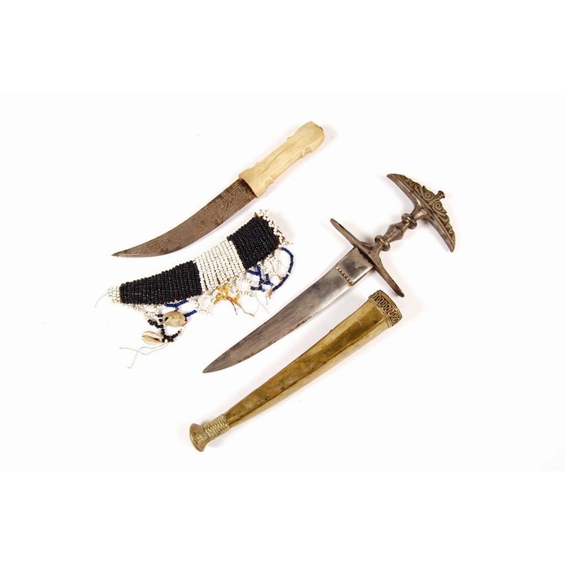 An African dagger, with a curved double edged blade and a steel handle with a faceted knop and scroll decorated top, 13in (33cm) l, with a brass cased scabbard and another dagger with an etched curved blade. (2)