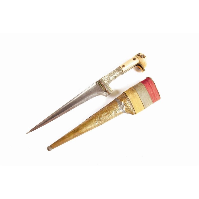 A 19th century Indian khyber knife, with engraved decoration and a bone handle, 11.5in (29cm) l, with scabbard.