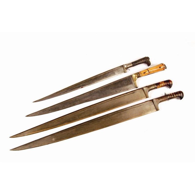 A 19th century khyber knife, with a part inlaid blade and ivory handle, 25.75in (65.5cm) l, and three khyber knives with bone handles. (4)