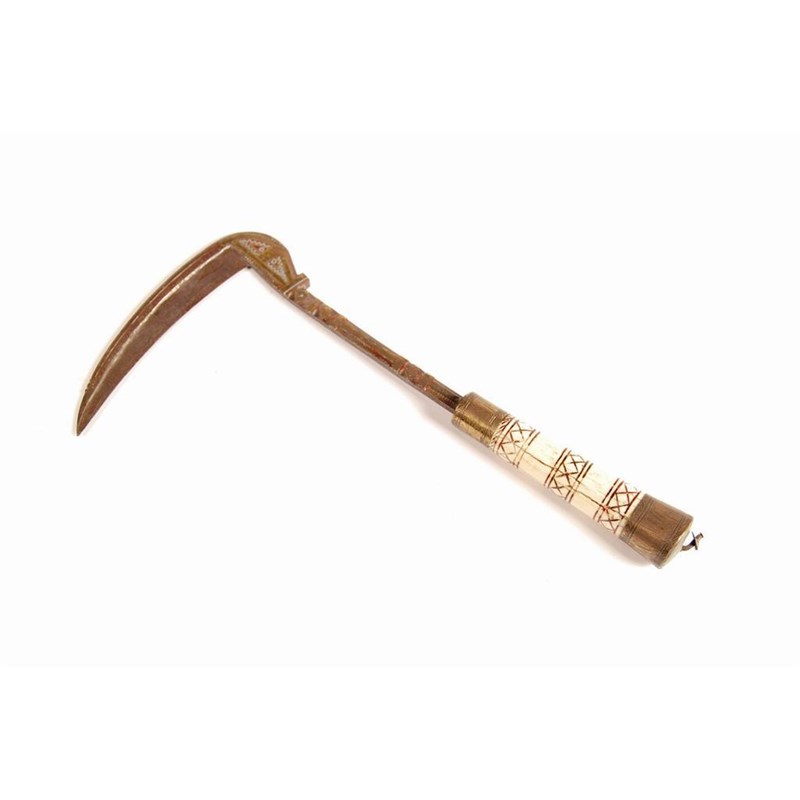 A small steel and brass adze, with overlaid decoration and an incised bone handle, 12.75in (32.5cm) l.