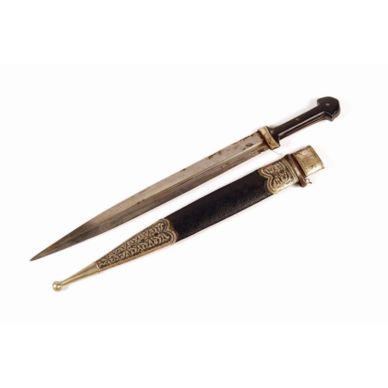 A Caucasian kindjal, with a double edged fullered blade and a shaped ebonised handle with applied niello work, 20in (51cm) l, with a scabbard.