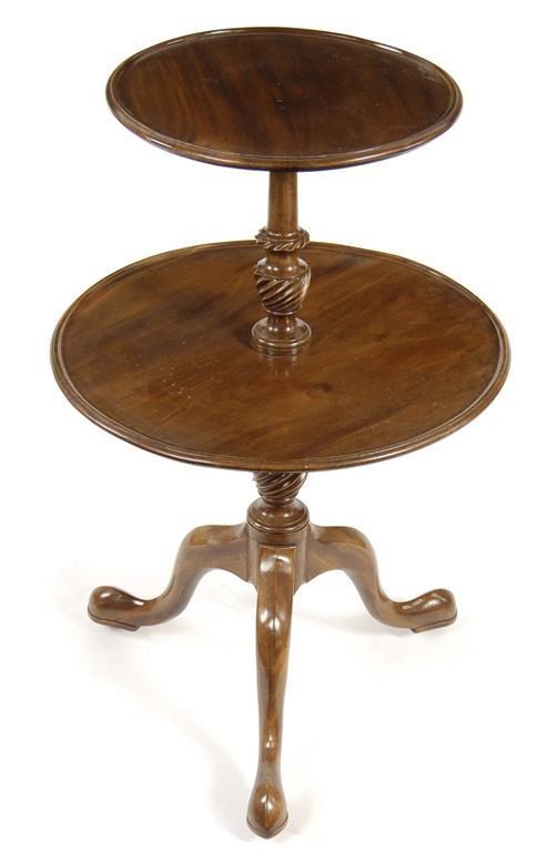 A mahogany dumb waiter, with two circular revolving dished tiers, on tripod supports and brass roller castors, 32.25in (82cm) h, 20.5in (52cm) dia. Reduced.