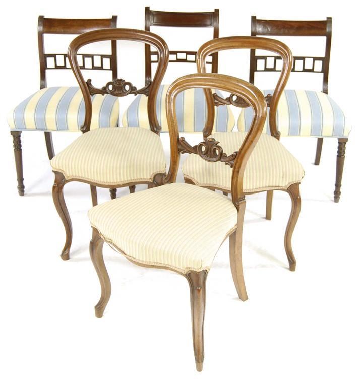 Three early 19th century mahogany side chairs, each with a Greek key horizontal splat, and three Victorian buckle back side chairs. (6)