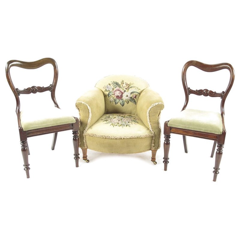 A late Victorian small tub shaped chair, on square tapering satin walnut legs with incised and painted floral decoration; and a pair of Victorian mahogany buckle side chairs. (3)
