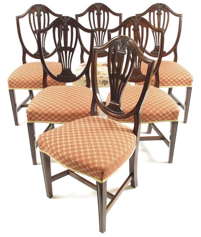 A set of six 19th century mahogany dining chairs, with pierced shield backs carved wheat ears and stiff leaves, one with different upholstery, together with two open armchairs. (8)