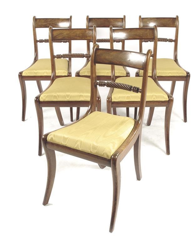 A set of six early 19th century mahogany dining chairs, with brass strung top rails above a rope twist splat. (6)