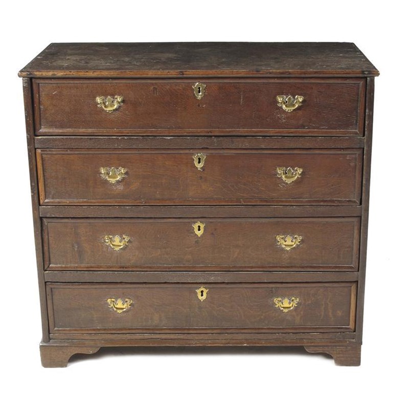 An oak chest of four long drawers, with applied moulded edges and replaced brass handles, adapted from an 18th century chest, 33.5in (85cm) h, 36.5in (92.5cm) w, 19in (48cm) d.