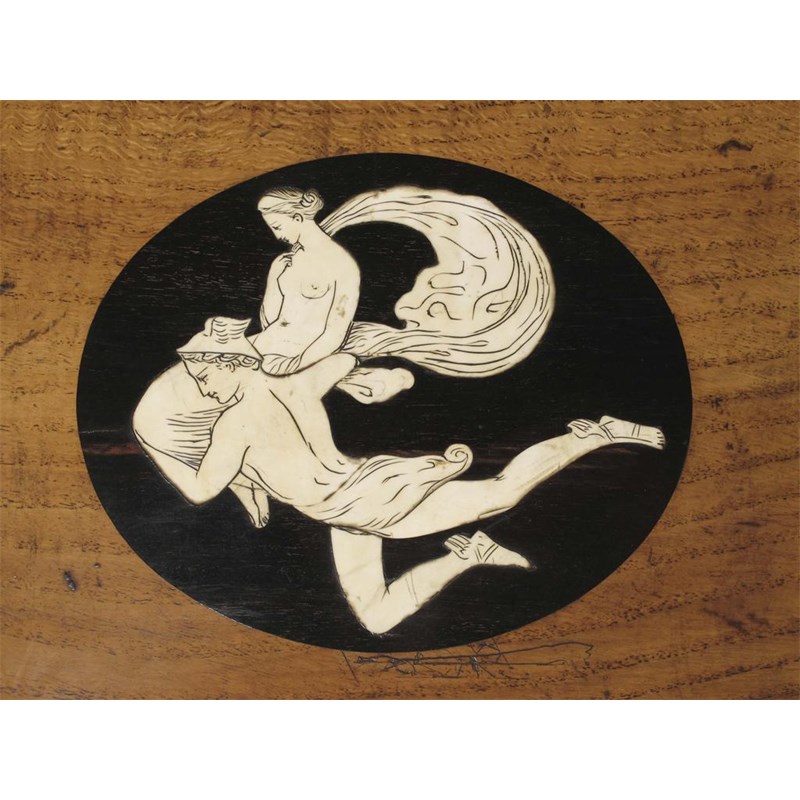 A Victorian oak easel or lectern, with carved flower finials to a hinged adjustable rest inlaid in ebony and ivory a Greek key band and an oval panel depicting Mercury carrying Psyche to heaven, on hinged supports united by spiral twist stretchers, 58in (147cm) h, 21.75in (55.2cm) w.