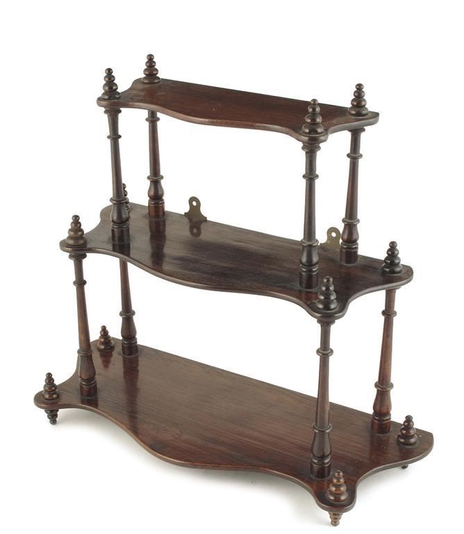 A set of Victorian miniature rosewood serpentine front hanging shelves, of three graduated tiers, 13.5in (34cm) h, 15in (38cm) w, 6.25in (16cm) d.