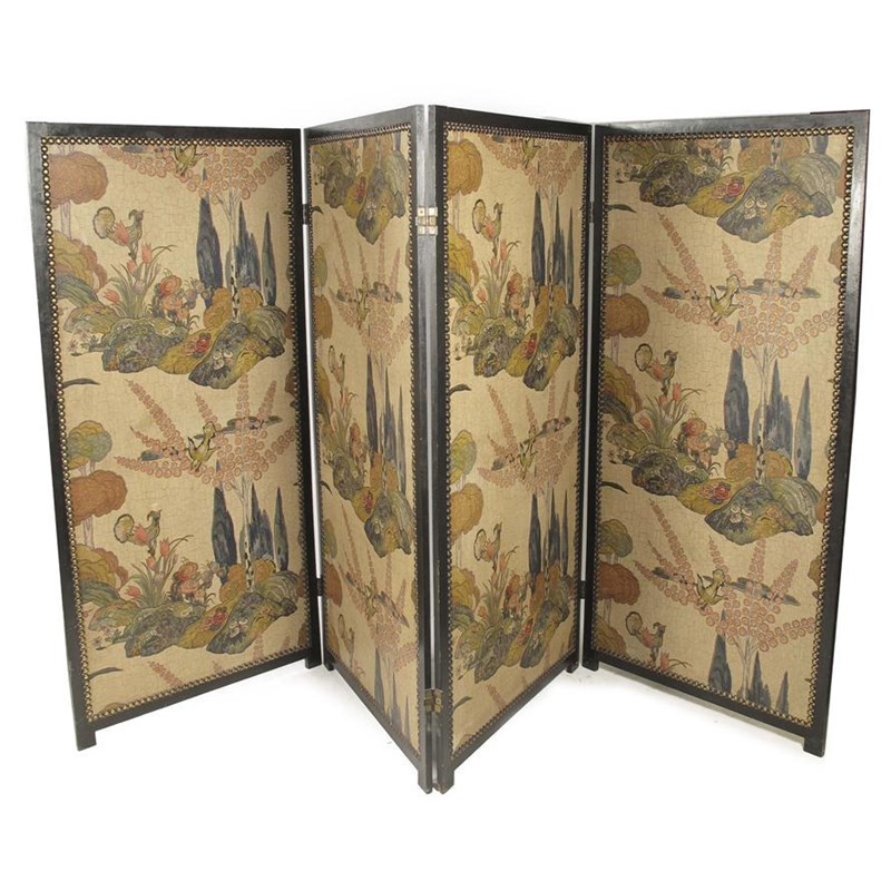 A painted wood frame four fold screen, the panels decorated birds within garden landscapes, the reverse panels with oriental vases and flowers, 65.25in (165.5cm) h, 31.5in (80cm) w each panel.