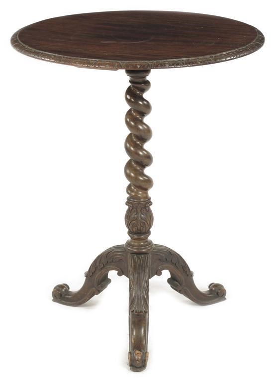 A Victorian tripod table, with a carved edge mahogany circular top on a turned and carved walnut base, 29in (74cm) h, 22.5in (57cm) dia.