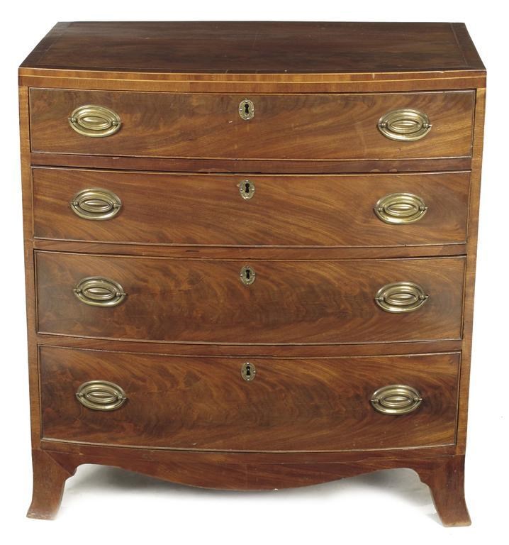 A small mahogany bowfront chest, with a crossbanded top with stringing, above four long graduated drawers fitted oval brass plate handles, 31.75in (81cm) h, 31in (79cm) w, 19.25in (49cm) d.