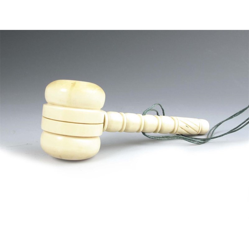 A turned and incised ivory gavel, with a pierced hole through the handle, 4.75in (12cm) l.