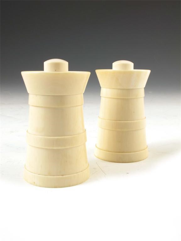 A pair of turned ivory pepper mills, by Park Green & Co., 3in (7.5cm) h. (2)