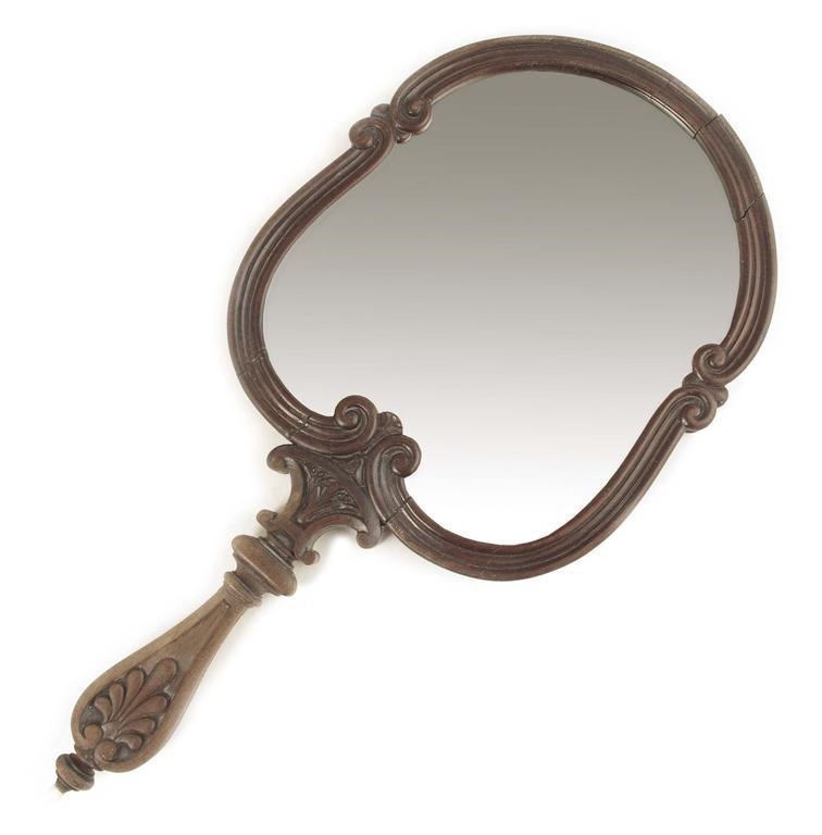 A late 19th century carved mahogany hand mirror, with an ivory finial, 16.25in (41cm) l.