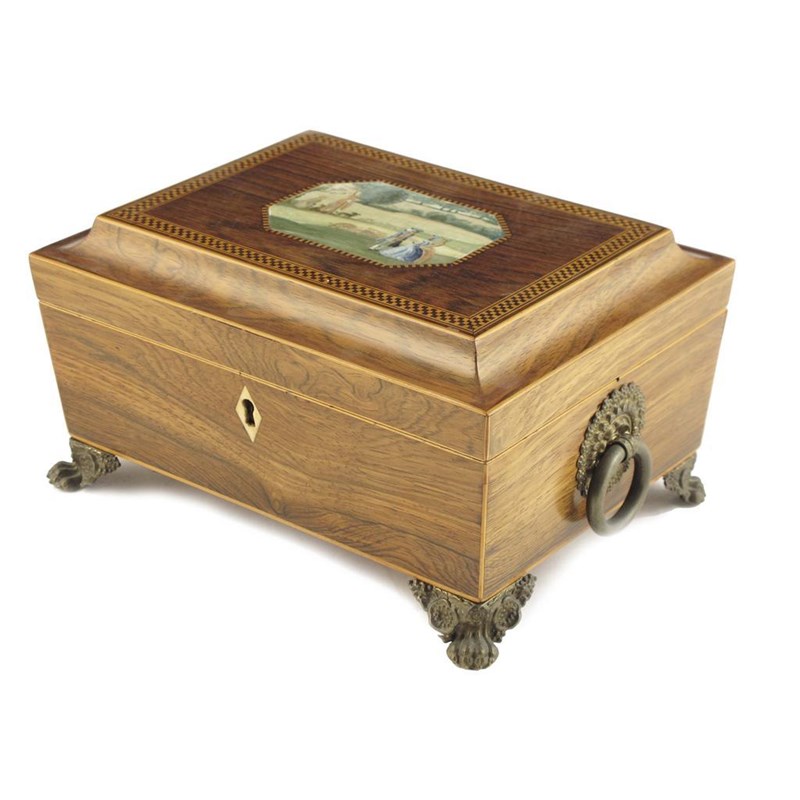 A late Regency rosewood box, with a repainted pastoral scene with a hinged cover, with chequer banding and boxwood stringing to a later baize lined interior with brass plate ring handles and feet, 4.75in (12cm) h, 9in (23cm) w, 6.5in (16.5cm) d.