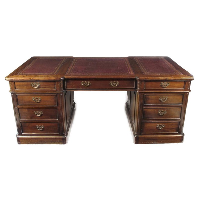 A mahogany partner's pedestal desk, in Victorian style, the inverted breakfront top inset three leather panels above three frieze drawers either side, each pedestal with three drawers and a cupboard, 29.5in (75cm) h, 71in (180.5cm) w, 35.5in (90cm) d.