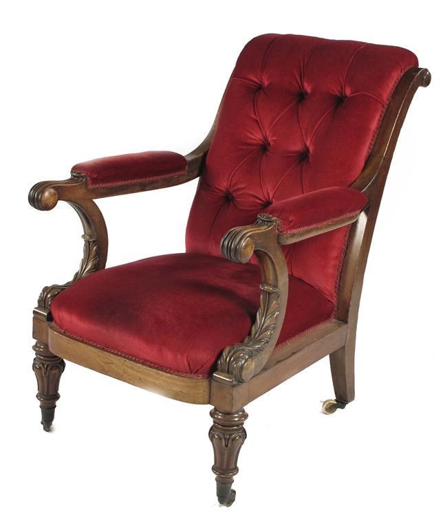A William IV mahogany library armchair by C. Bulstrode, London, with a button upholstered scroll back to padded open arms with moulded terminals and leaf scroll supports, the barrel front seat frame on turned and moulded legs with brass castors, stamped 'crowned W.LEWTY'S PATENT', the underside stamped twice 'BULSTRODE, 50 Paddington Street, MARYLEBONE'.
