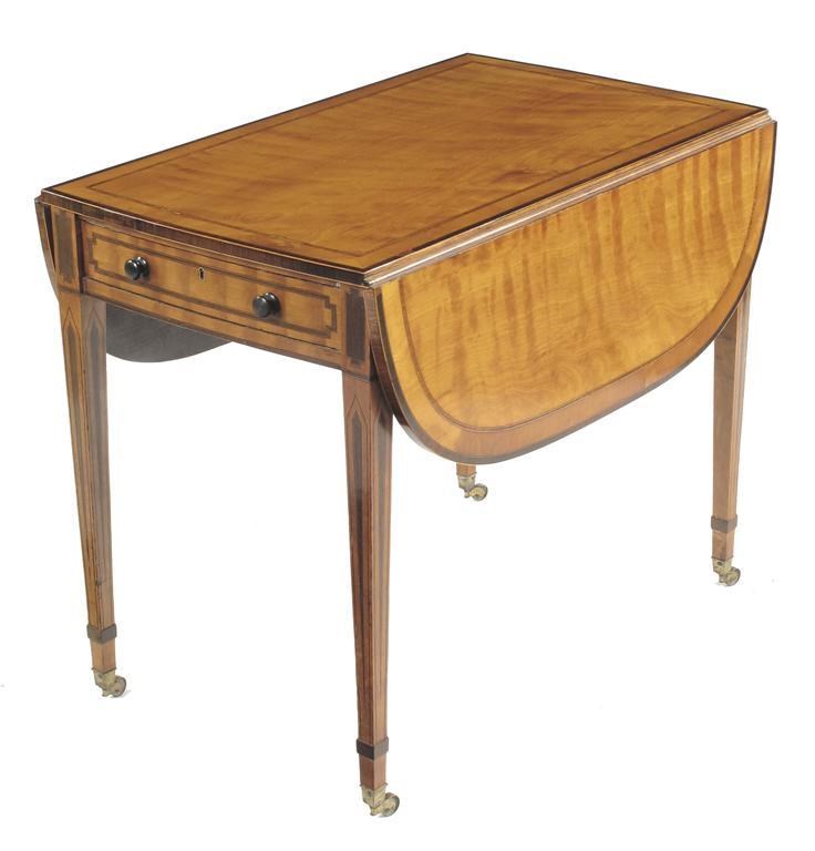 A 19th century satinwood Pembroke table, the crossbanded twin flap top with further banding in tulipwood and kingwood above a bowfront end frieze drawer, on inlaid square tapering legs with applied collars and brass castors, 27in (68.5cm) h, 20.5in (52cm) w closed, 32in (81.5cm) l.