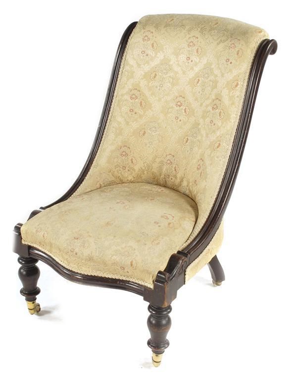 A Victorian mahogany frame nursing chair, the brass sabots stamped 'CLARKE & TIMMINS'.