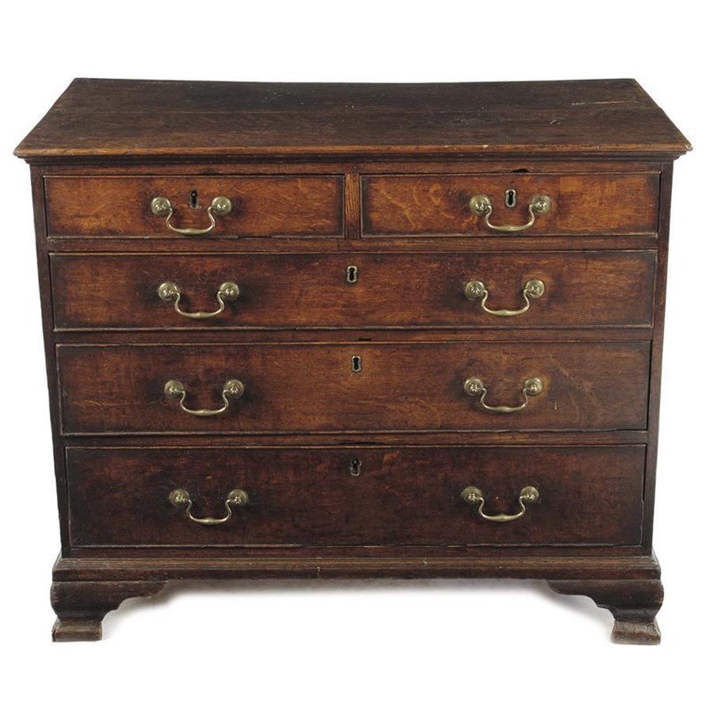A George III oak chest, with two short and three long graduated drawers, fitted replaced brass handles on ogee bracket feet, 31in (79cm) h, 37.75in (96cm) w, 20.25in (51.5cm) d.