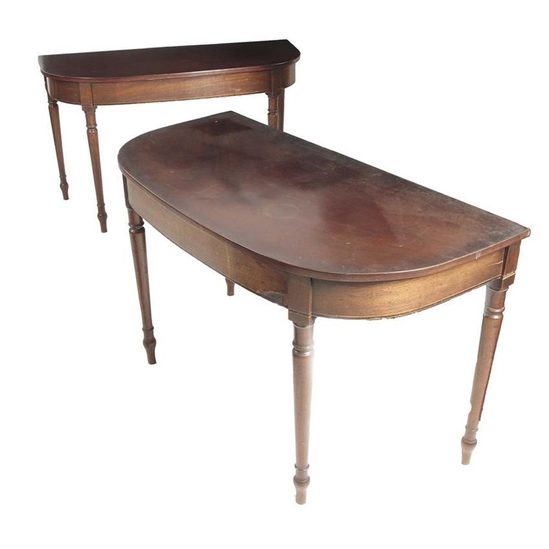 A pair of Regency mahogany 'D' end tables, with ebonised and boxwood strung friezes, 28.25in (72cm) h, 47.5in (120.5cm) w, 22.75in (57.5cm) d. (2)