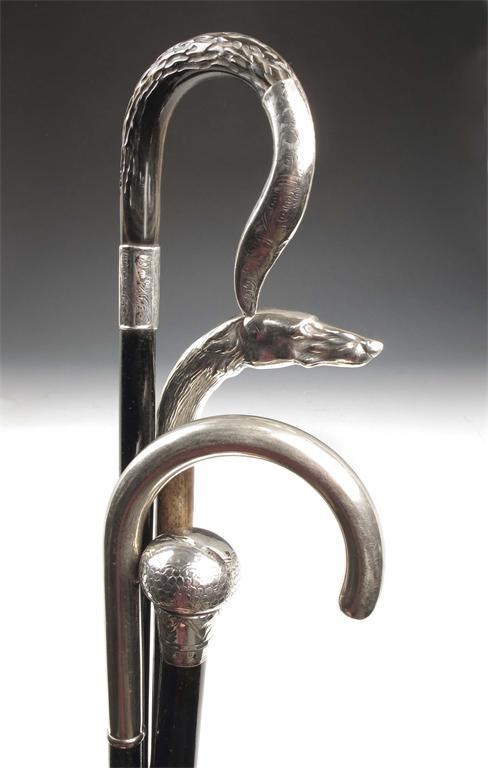 Four walking canes, comprising: a bamboo cane with a white metal Borzoi's head handle, 35in (88.7cm) l; an ebonised cane with a silver handle hallmarked London, 1924; and two other ebonised examples one with a horn and white metal handle; the other inscribed 'KRONPRINZ'. (4)