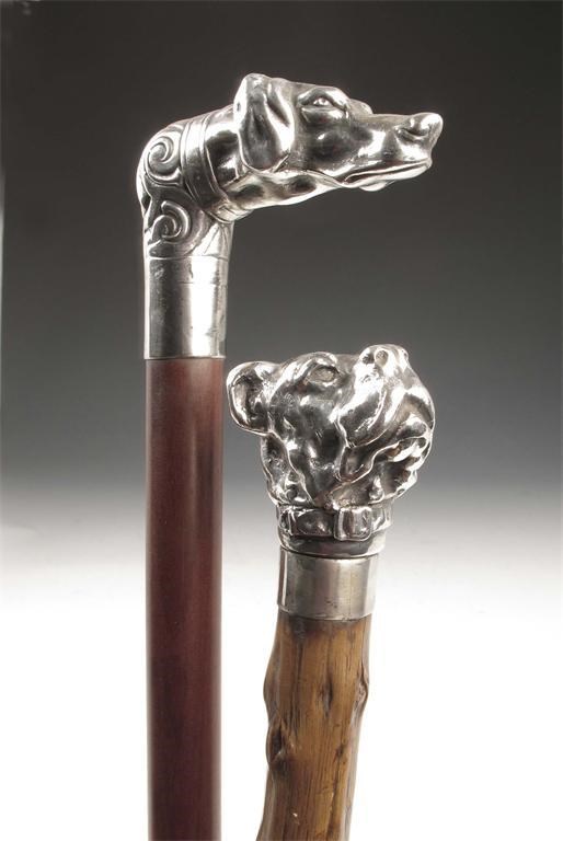 A late Victorian hazelwood walking cane, the silver handle in the form of a Boxer dog's head, the ferrule hallmarked London, 1889, 35.25in (89cm) l; and a hardwood walking cane with a white metal handle in the form of a dog's head. (2)
