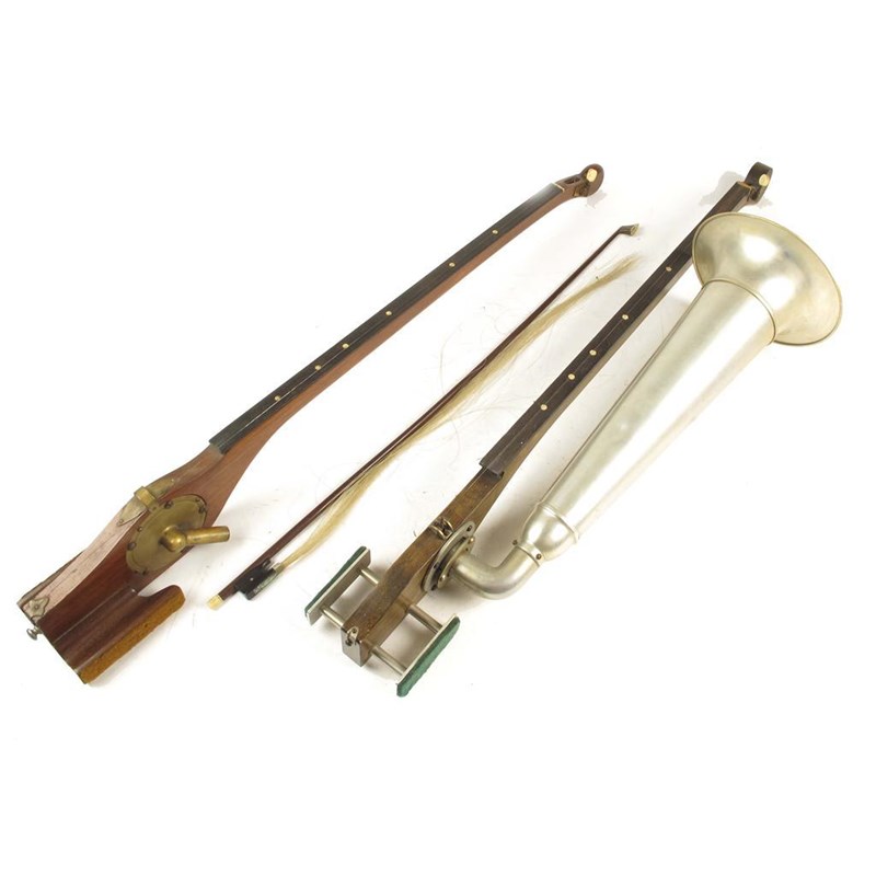 A Stroviols phono-fiddle, with horn and a bow; and another phono-fiddle lacking horn with bow. (4)