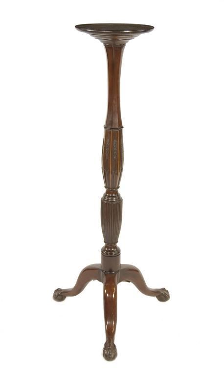 An Edwardian mahogany torchere, the faceted and ribbed stem with inlaid stringing and carved wheatear decoration on tripod supports and claw and ball feet, 50.25in (127.5cm) h, 22cm (56cm) w.