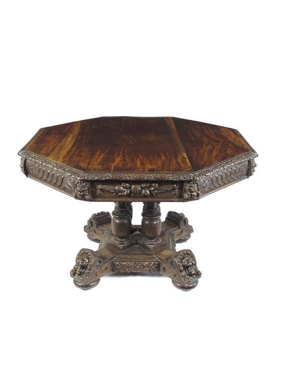 A 19th century carved oak octagonal centre table, the top with four frieze drawers, on a central quadruple baluster support, the base with lion terminals on brass castors, 29.75in (75.5cm) h, 48in (122cm) w.
