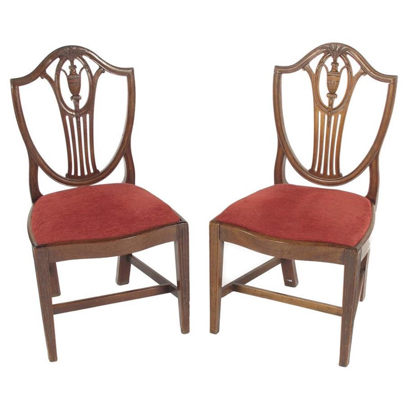 A pair of early 19th century mahogany shield back side chairs, with carved urn and wheat sheath. (2)