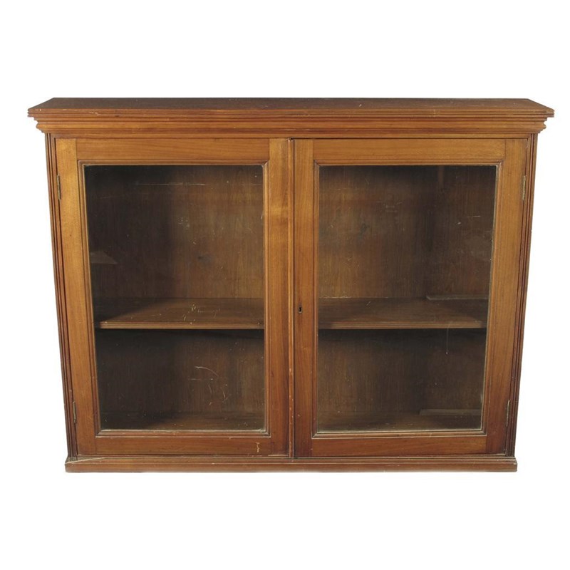 A late Victorian walnut cabinet, with a pair a glazed panel doors, enclosing two adjustable shelves, 41.25in (104.5cm) h, 53.25in (135cm) w, 11.5in (29cm) d.