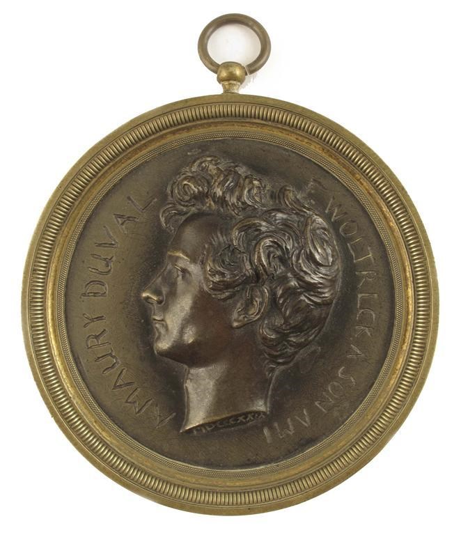 An early 19th century bronzed portrait medallion, of Amaury Duval after Franz Woltreck, with date for 1829, in a gilt brass frame with suspension loop, 5in (12.5cm) dia.
