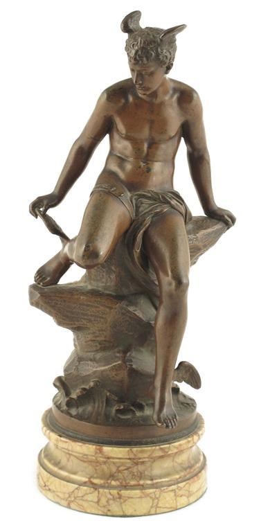 Bouret. French 19th century. Mercury seated on a rock, bronze signed on a turned marble base, 12in (30.5cm) h.