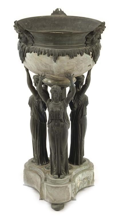 An Italian bronze and marble athenienne, the rim of the bowl with bands of Greek key, stiff leaf and anthemion decoration and with male masks, supported by three caryatid supports, the faceted stem with swags and palmettes, on a triform base, 19th century, possibly Neapolitan, 29.25in (74.4cm) h, 15in (38cm) dia. Old damages to marble, with repairs and losses.