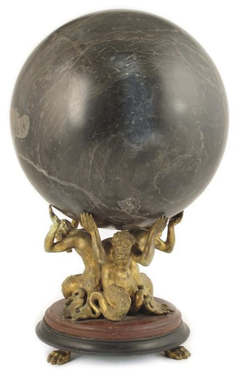 A marble globe on three gilt brass mermen supports, 12.5in (32cm) h.
