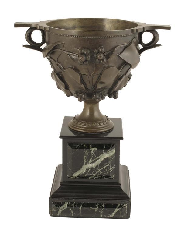 A French bronze urn, with relief ivy decoration on a marble plinth, late 19th century, 12in (30.5cm) h.