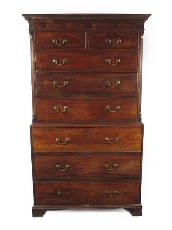 A George III mahogany secretaire chest on chest, the top half with canted fluted angles, the base with a secretaire drawer fitted a central mirror door with serpentine outline, flanked by pigeon holes and drawers, the replaced brass lock stamped 'GR Crowned PATENT', on bracket feet, slightly reduced, fitted replaced brass swan neck handles, 75.5in (192cm) h, 44.5in (113cm) w, 21.75in (55.5cm) d.