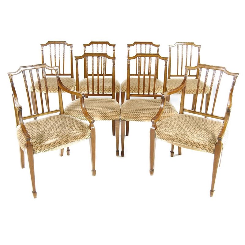 A set of eight mahogany dining chairs in Sheraton style, each with an arched rectangular back with leaf carved vertical splats, to a stuffed-over serpentine seat on square tapering legs and spade feet, comprising: two open armchairs and six side. (8) Damages.